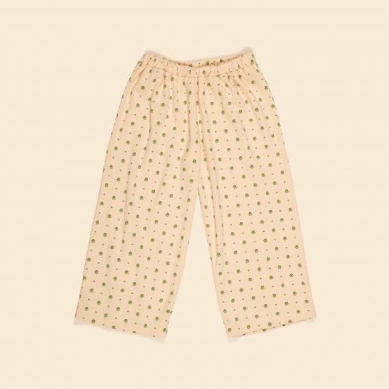 やわらかなリブコットンジャージーにMeadow Calico”プリントをあしらったMilaトラウザー。